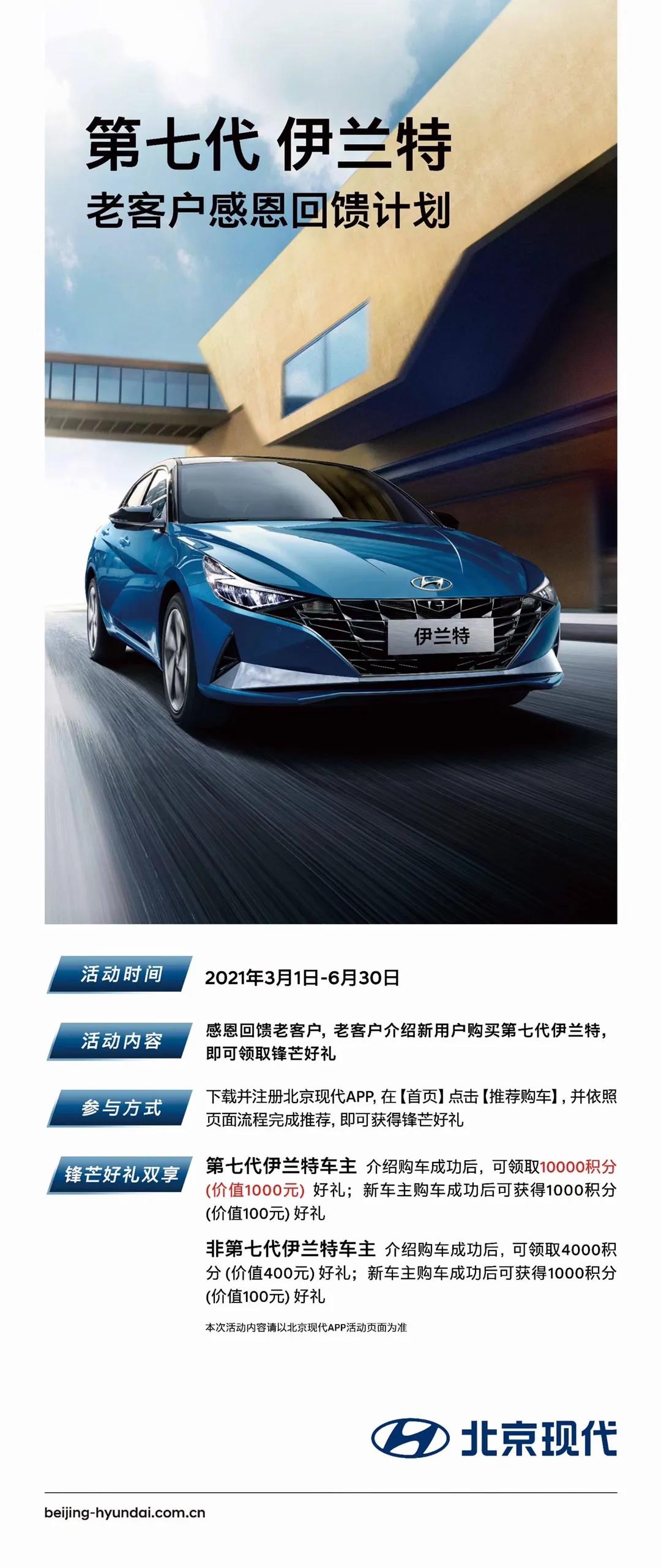 尊敬的第七代伊蘭特車主,您好!為回饋廣大客戶的長期支持,現(xiàn)推出“第七代伊蘭特老客戶感恩回饋計(jì)劃”,通過北京現(xiàn)代 APP 推薦好友成功購買第七代伊蘭特(第七代伊蘭特車主)推薦可得 10000 積分(價(jià)值 1000 元)被推薦人可得 1000 積分(價(jià)值 100 元)
